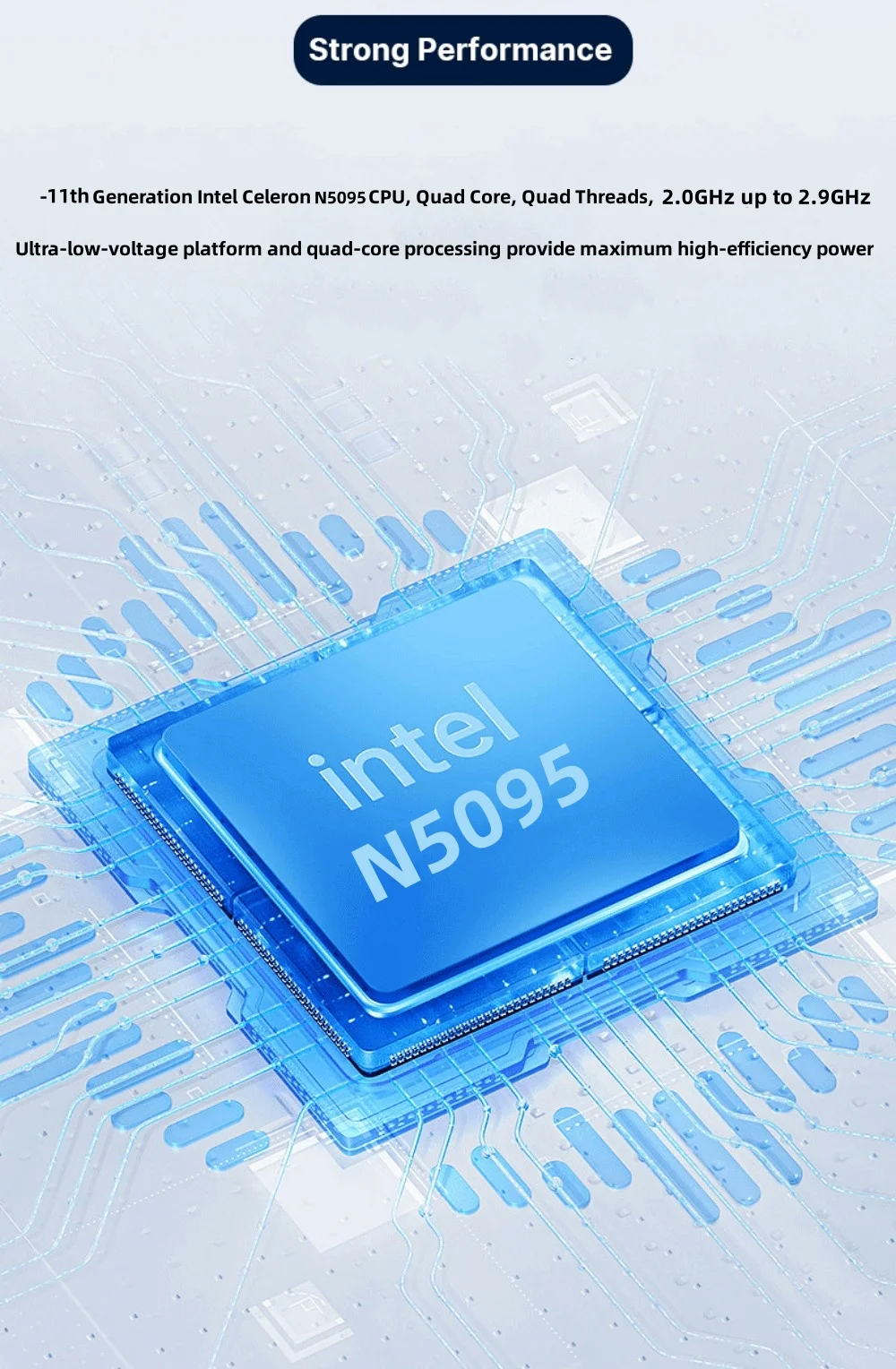 -CPU Intel Celeron N5095 de 11ª Geração, Quad Core, Quad Threads, 2.0GHz, até 2.9GHz