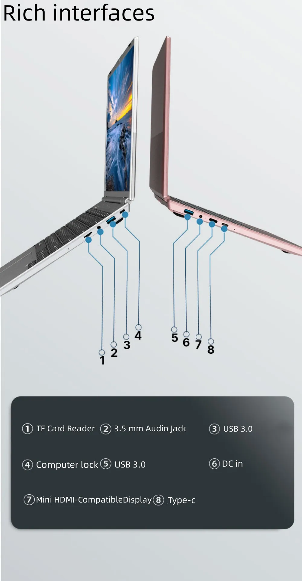 -Interfaces: 3.5mm fone de ouvido, TYPE-C * 1,USB 3.0*2, slot para cartão TF, slot compatível com Micro HDMI.