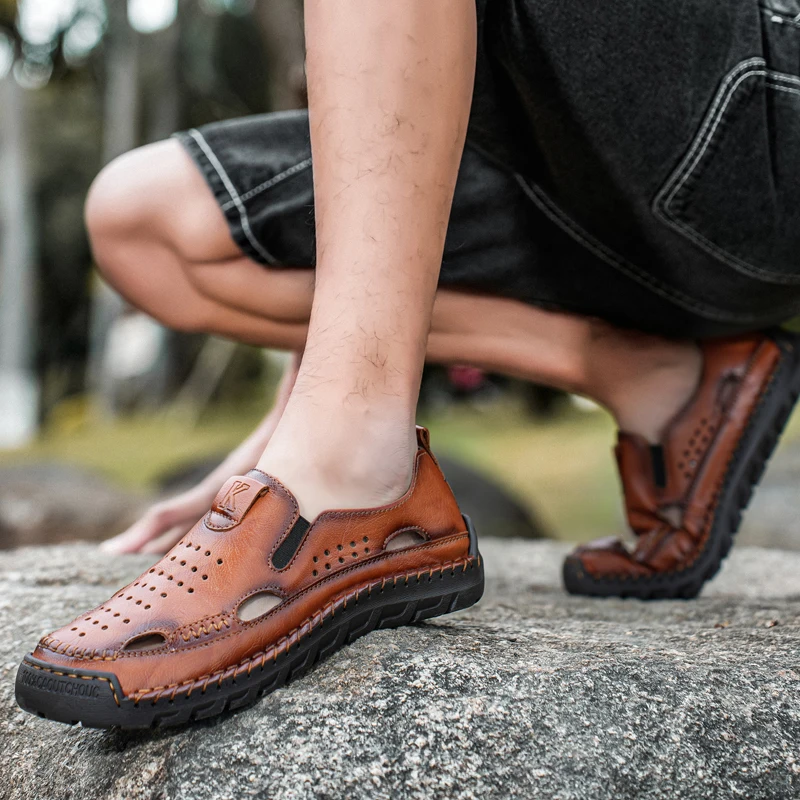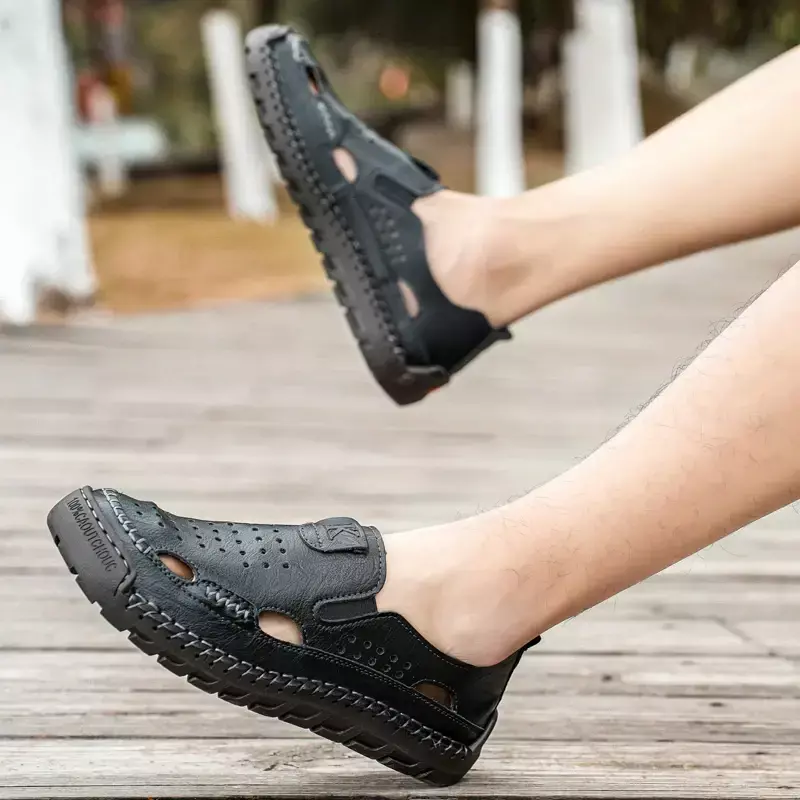 Sandálias Masculinas de Couro Dividido – Chinelos de Praia Respiráveis e Confortáveis
