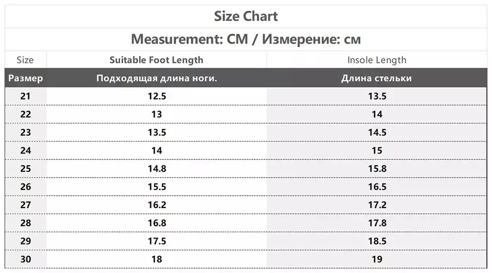 Observe que os tamanhos dos calçados infantis podem variar entre os diferentes países.Para garantir o melhor ajuste, recomendamos fortemente selecionar o tamanho com base em nossa tabela de tamanhos fornecida, em vez de sua escolha de tamanho normal.Se não tiver certeza, sinta-se à vontade para nos enviar o comprimento do pé do seu filho e teremos prazer em recomendar o tamanho mais adequado.Isso ajudará a evitar problemas de tamanho e economizará um tempo valioso, garantindo que os sapatos caibam perfeitamente desde o início!