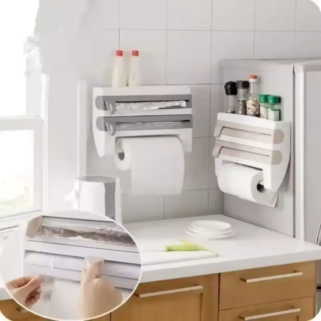 Otimize o espaço da sua cozinha com praticidade e organização! Este suporte de parede 4 em 1 é a solução ideal para manter seus utensílios e embalagens sempre à mão. Com design funcional e compacto, ele reúne porta rolo de papel toalhasuporte para filme plástico e papel alumínio, além de uma prateleira para condimentos e molhos.